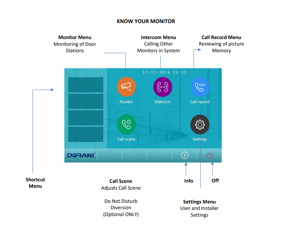 The Dorani C10 Intercom is an IP-based apartment intercom system designed for security and communication within buildings. End-users/Tenants should only adjust user-level settings, as installer-level settings can impact the system’s functionality. To use the Dorani C10 intercom system, you’ll primarily interact with the monitor inside your apartment. When a visitor calls from the door station, the monitor will ring, and you can answer by pressing one of the communication buttons (without holding). You can then talk to the visitor hands-free. To grant access, press one of the unlock buttons. To end the conversation, press the communication button again.