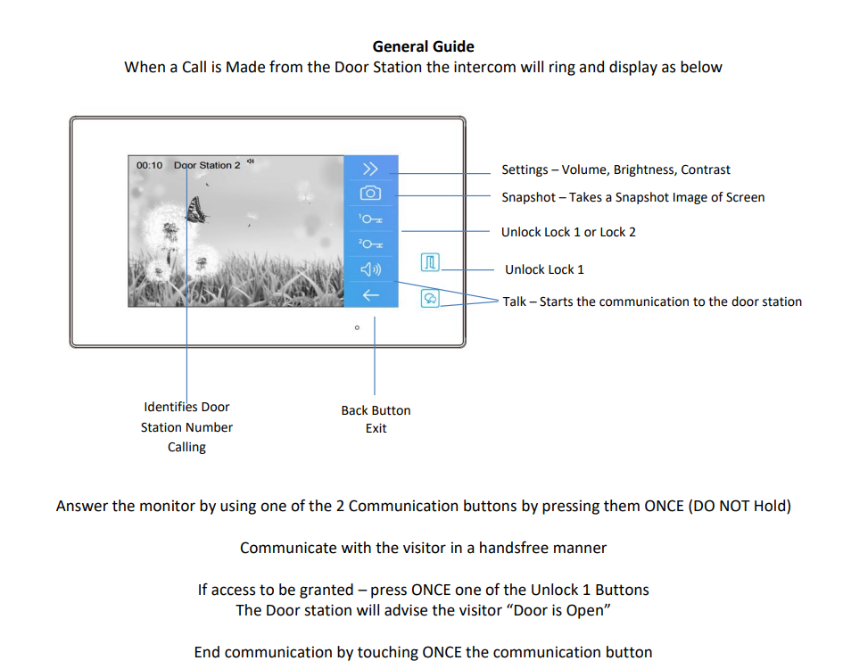 Answering a Call: When a visitor calls from the door station, the intercom will ring and display information about the call on the monitor. Press one of the communication buttons (labeled “Talk”) to answer. Do not hold the button down.